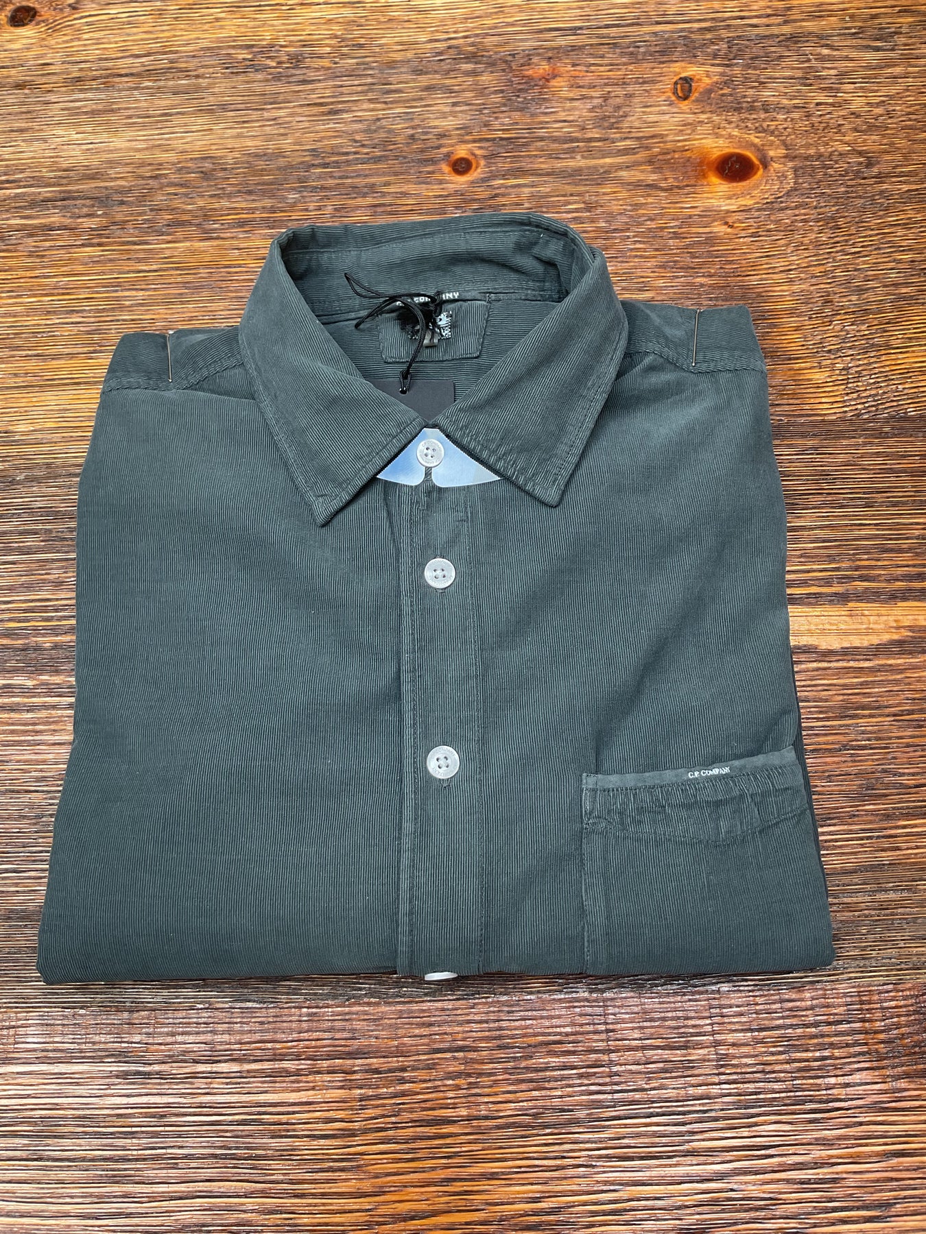 C.P. Company long sleeve dress casual corduroy shirt in a thin whale khaki green colour. Medium weight and in a regular fit.