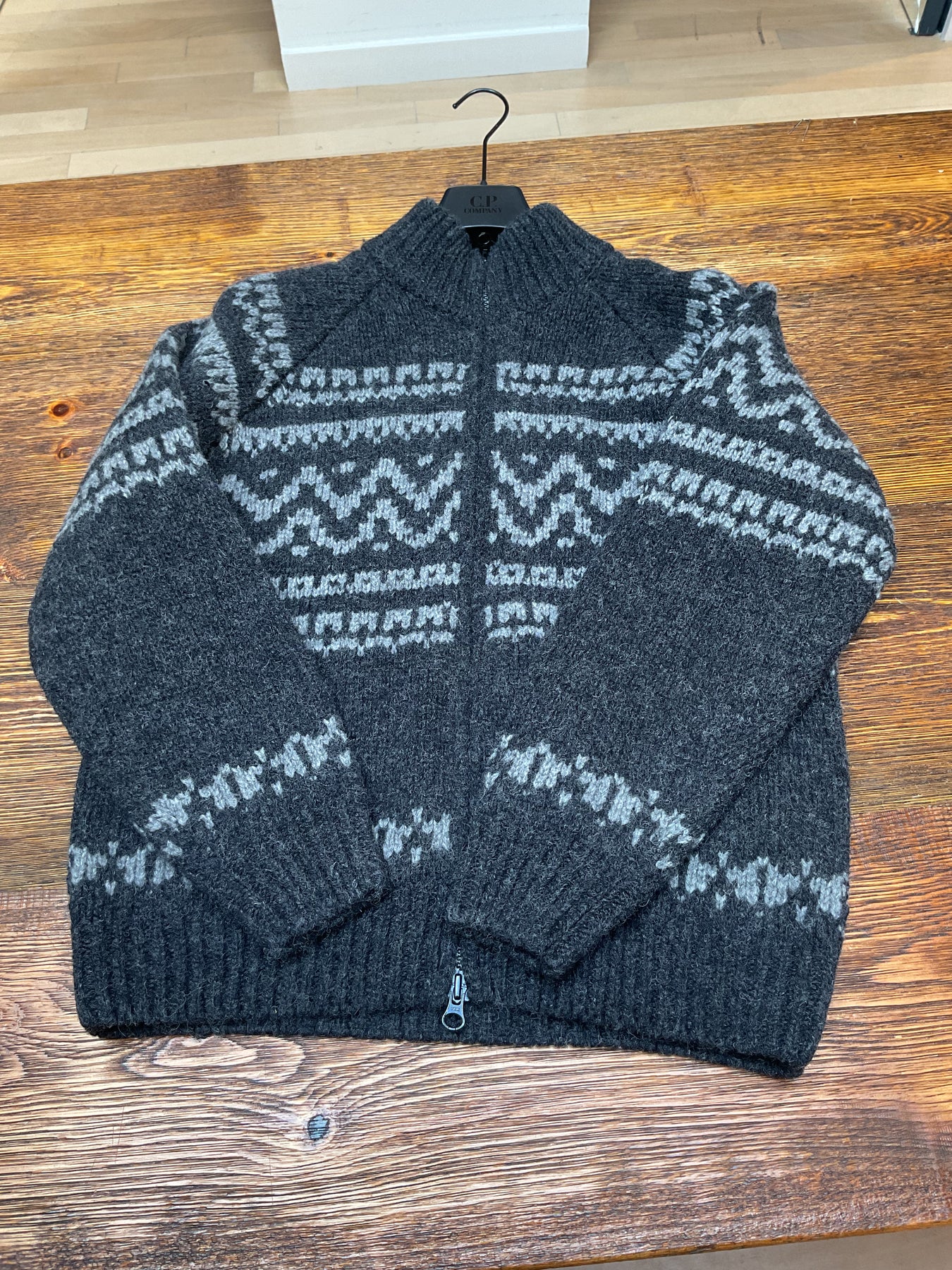 C.P. Company heavyweight wool cardigan sweater in shades of grey. Large logo on backside with full zipper front. Regular fit and made in Italy.