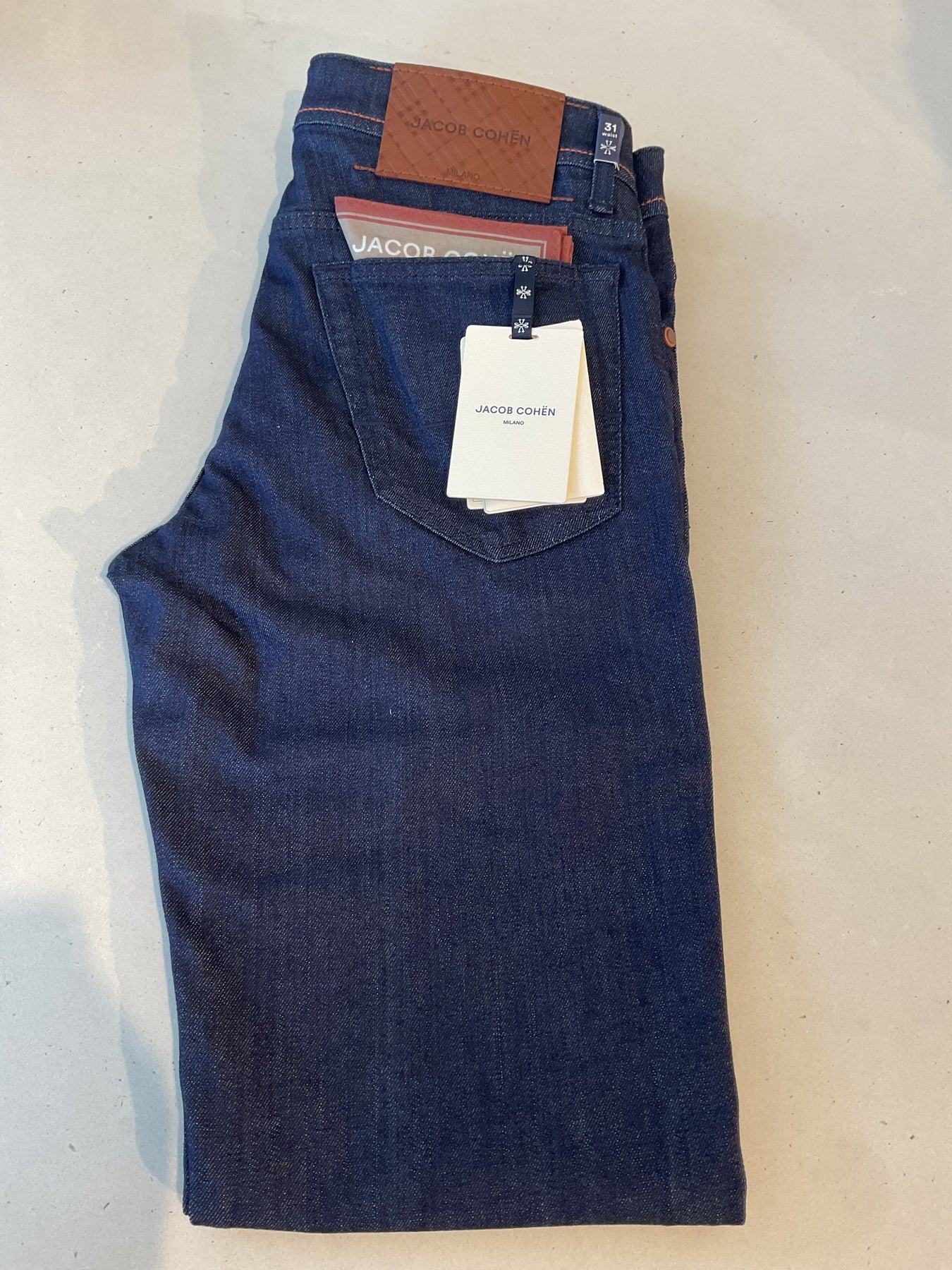 Jacob Cohen classic slim fit Bard five pocket denim. Made up in a very dark blue indigo denim colour. Slim modern fit and made in Italy.