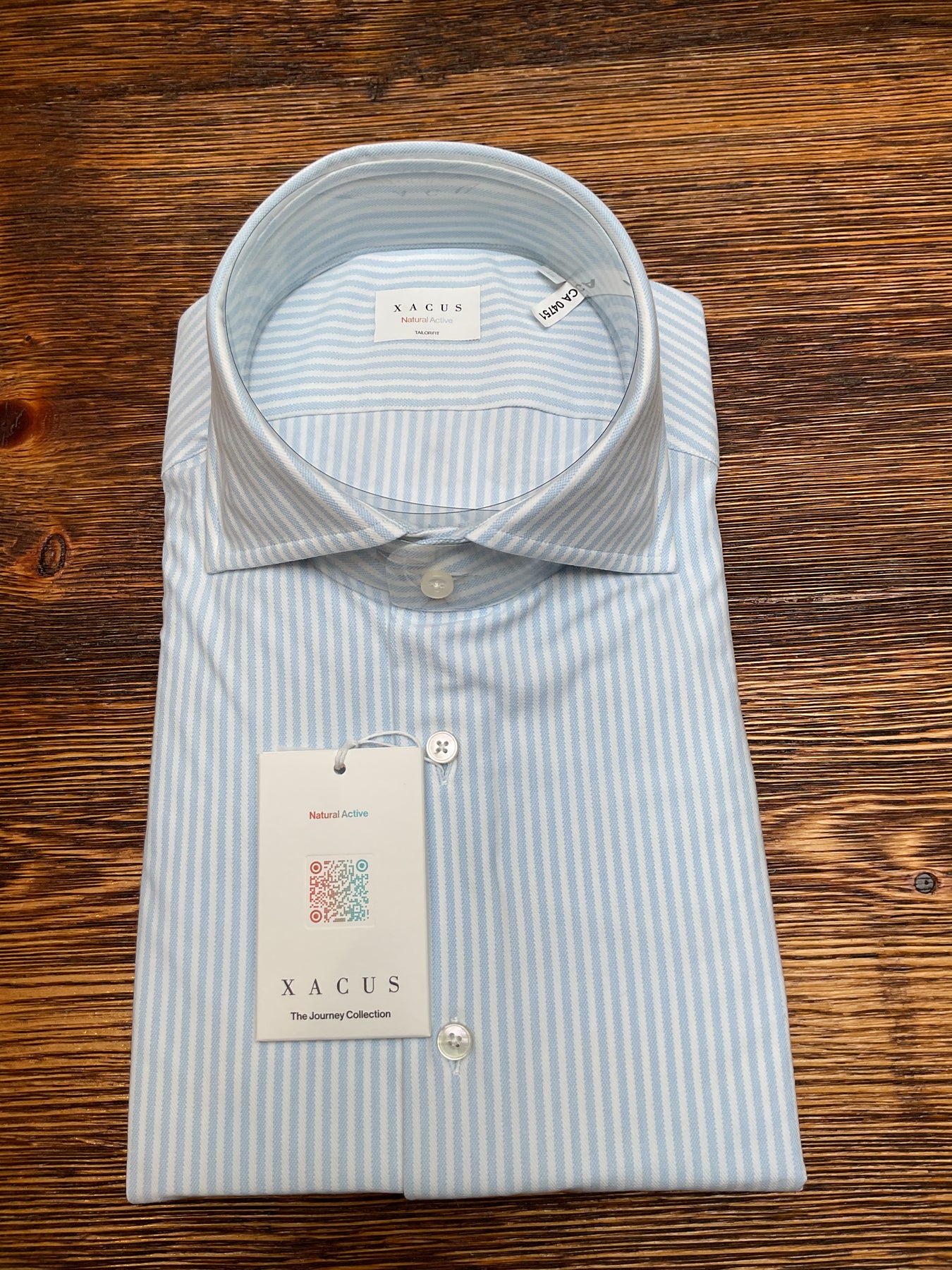 Xacus full button long sleeve stretch cotton shirt. Made up in a white body with light blue stripes. Appropriate for both dress and casual events. Slim modern fit and made in Italy.