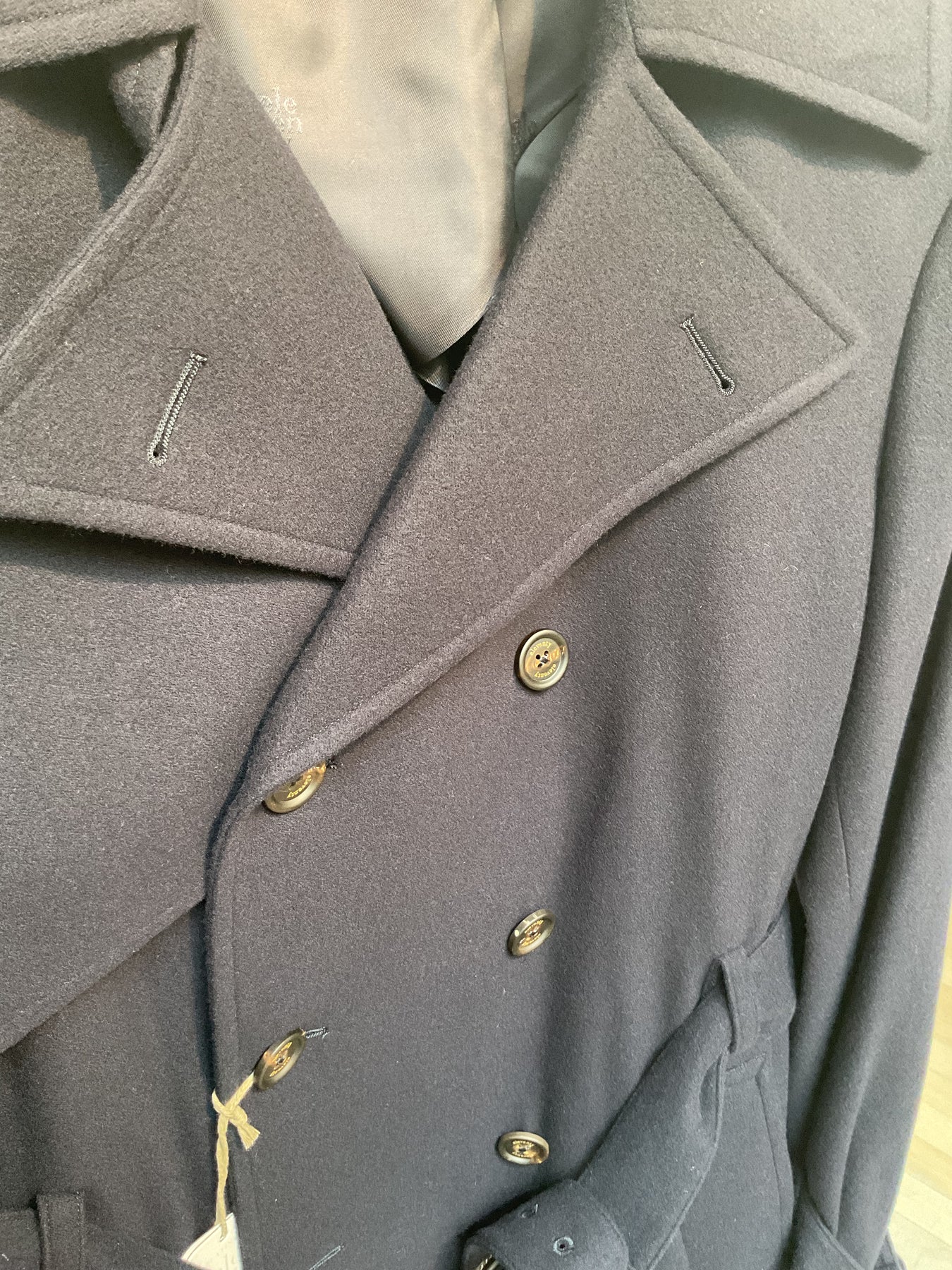 Eleventy long double breasted outerwear coat in 100% wool. Made up in dark navy with removable waist strap. New fuller body fit and made in Italy.