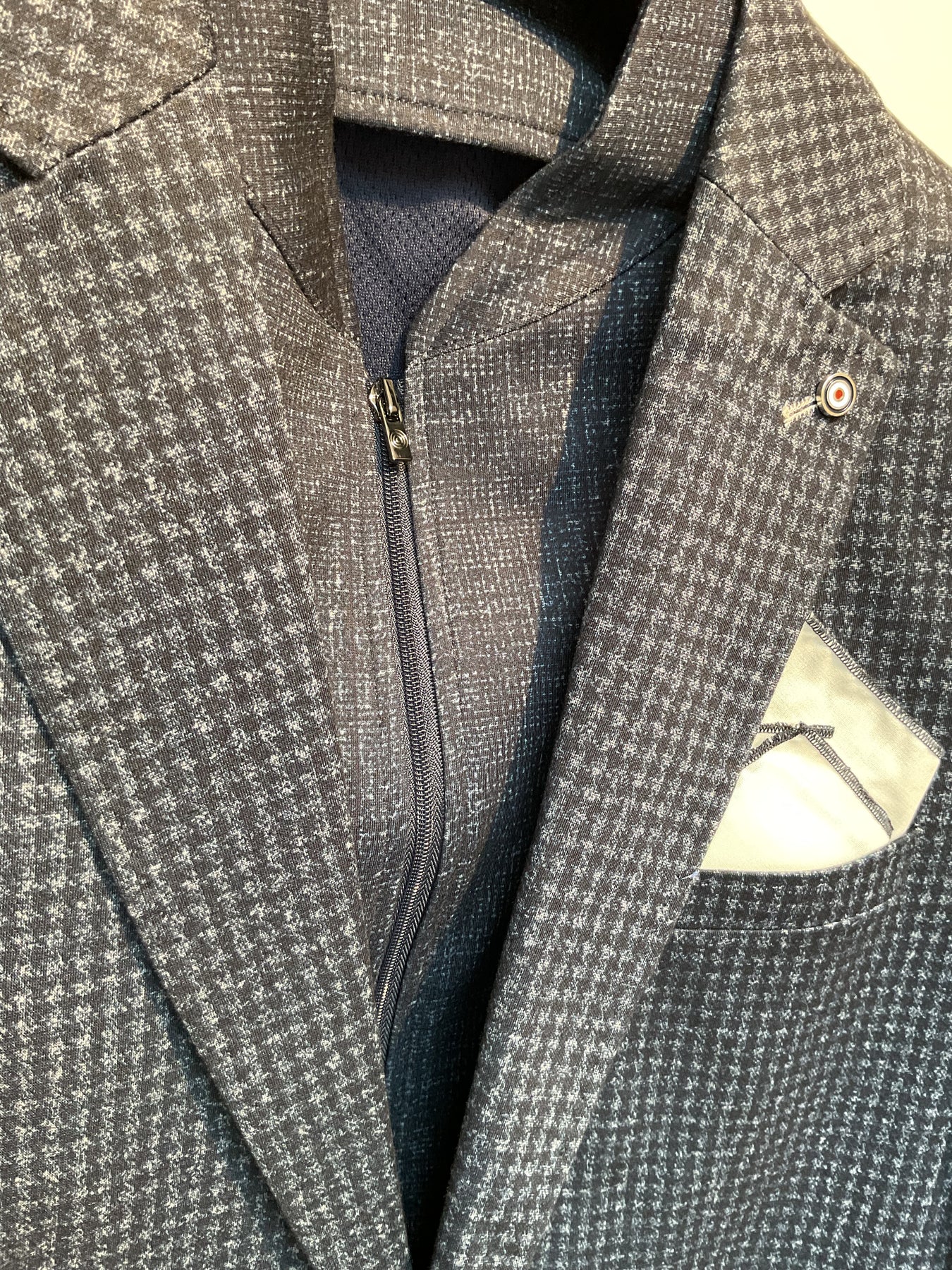 Blue Industry hybrid hounds tooth jacket with removable insert. Fully lined two button classic blazer when the insert is removed. Blue mainly with a little grey in the hounds tooth pattern.