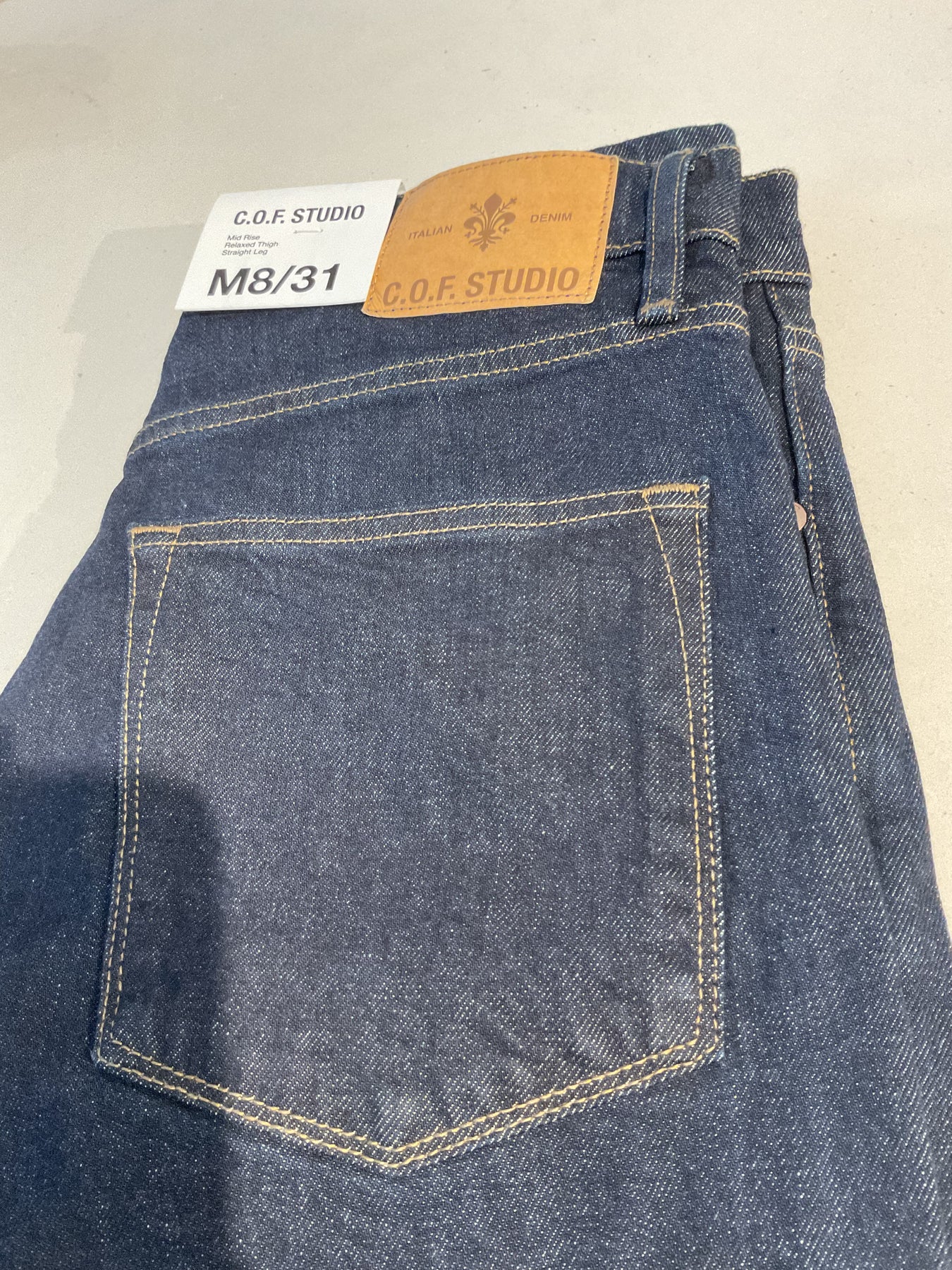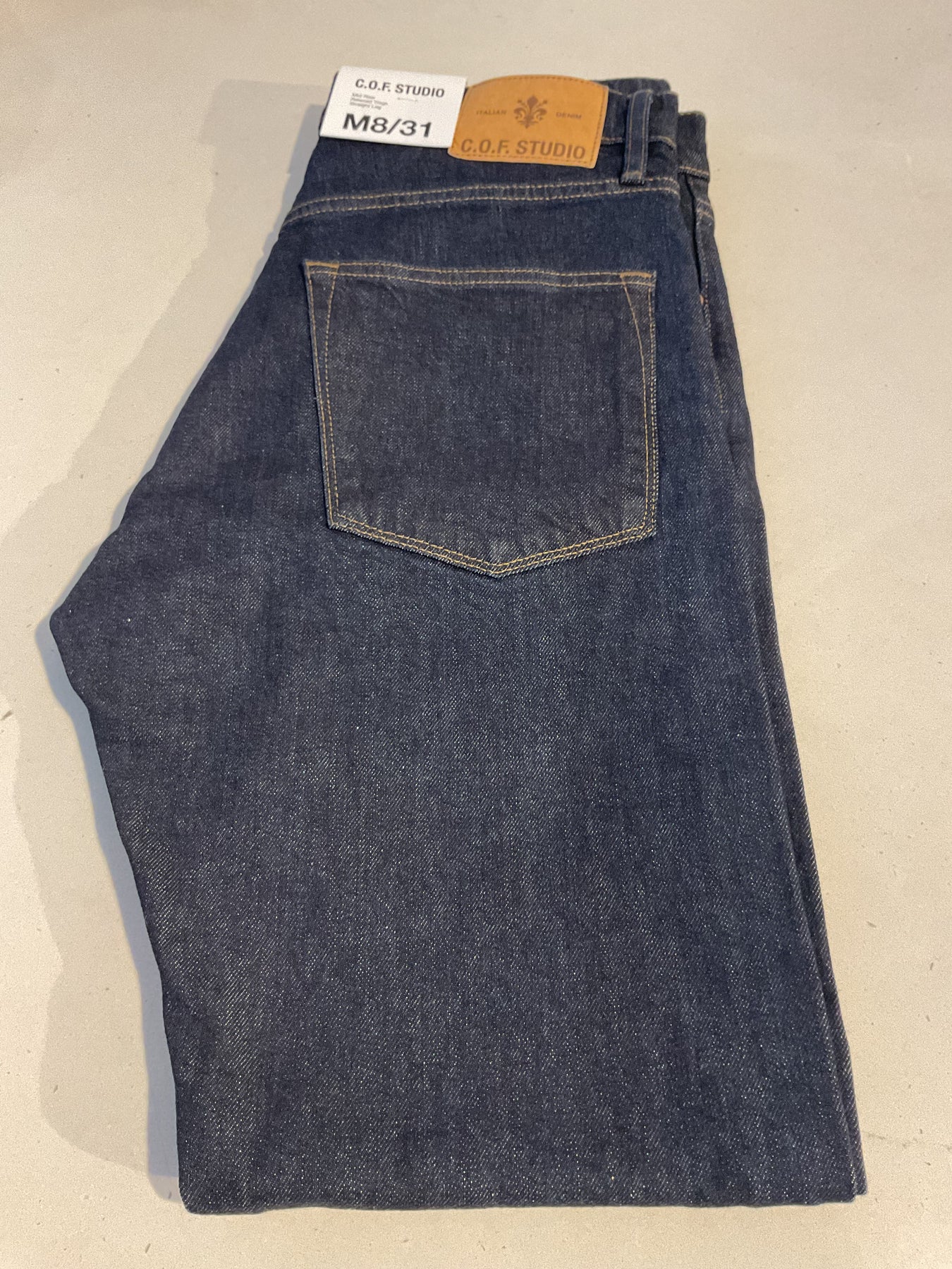 C.O.F. Studio classic straight leg cotton five pocket pant. Made up in a raw denim with a little stretch for comfort. Working zipper fly on a medium rise waist. Appropriate for all four seasons.