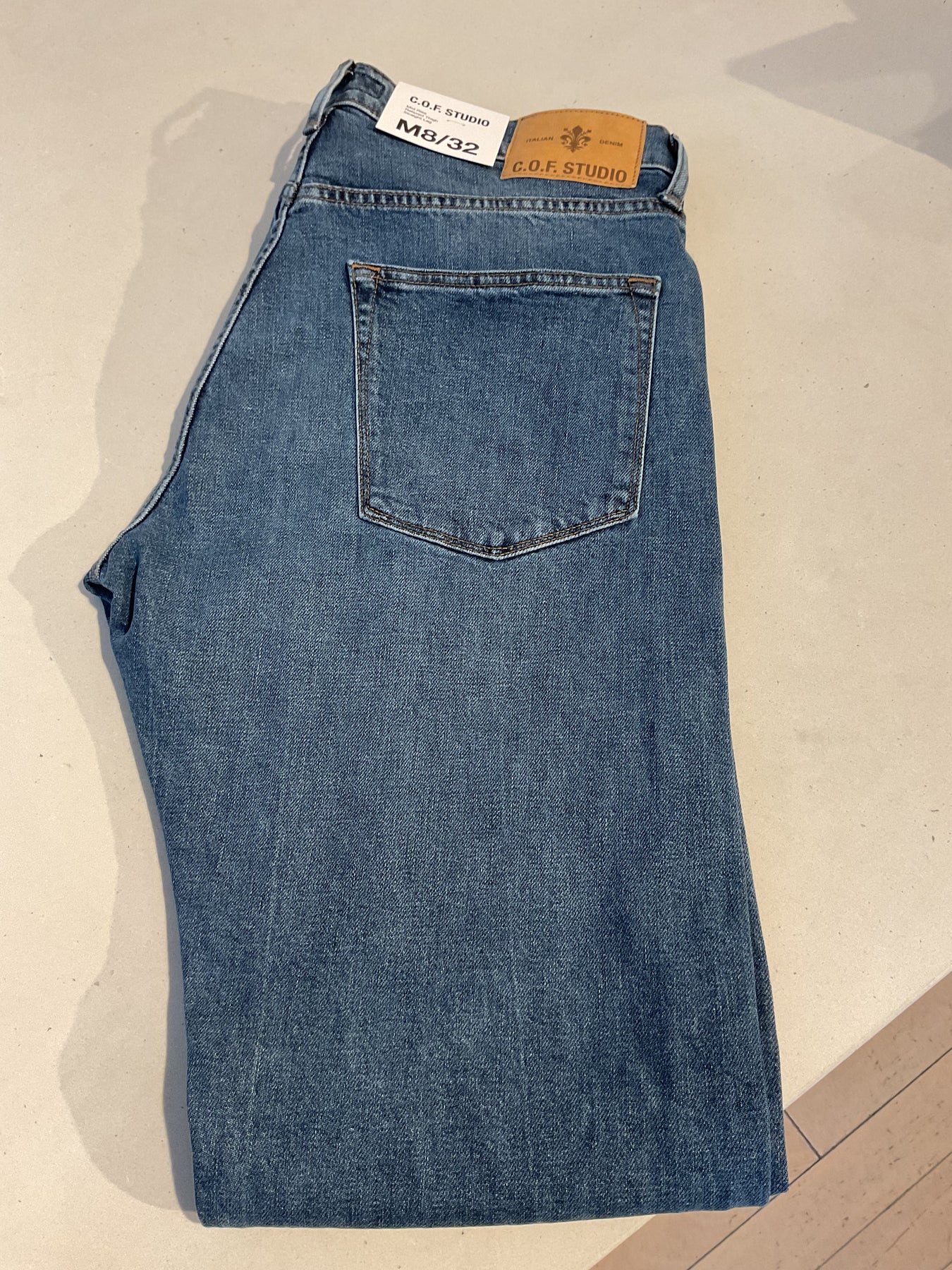 Circle of Friends Studio classic straight leg cotton five pocket pant. Made up in a washed Candini indigo denim. Medium rise with full working zipper fly. Appropriate for all four seasons.