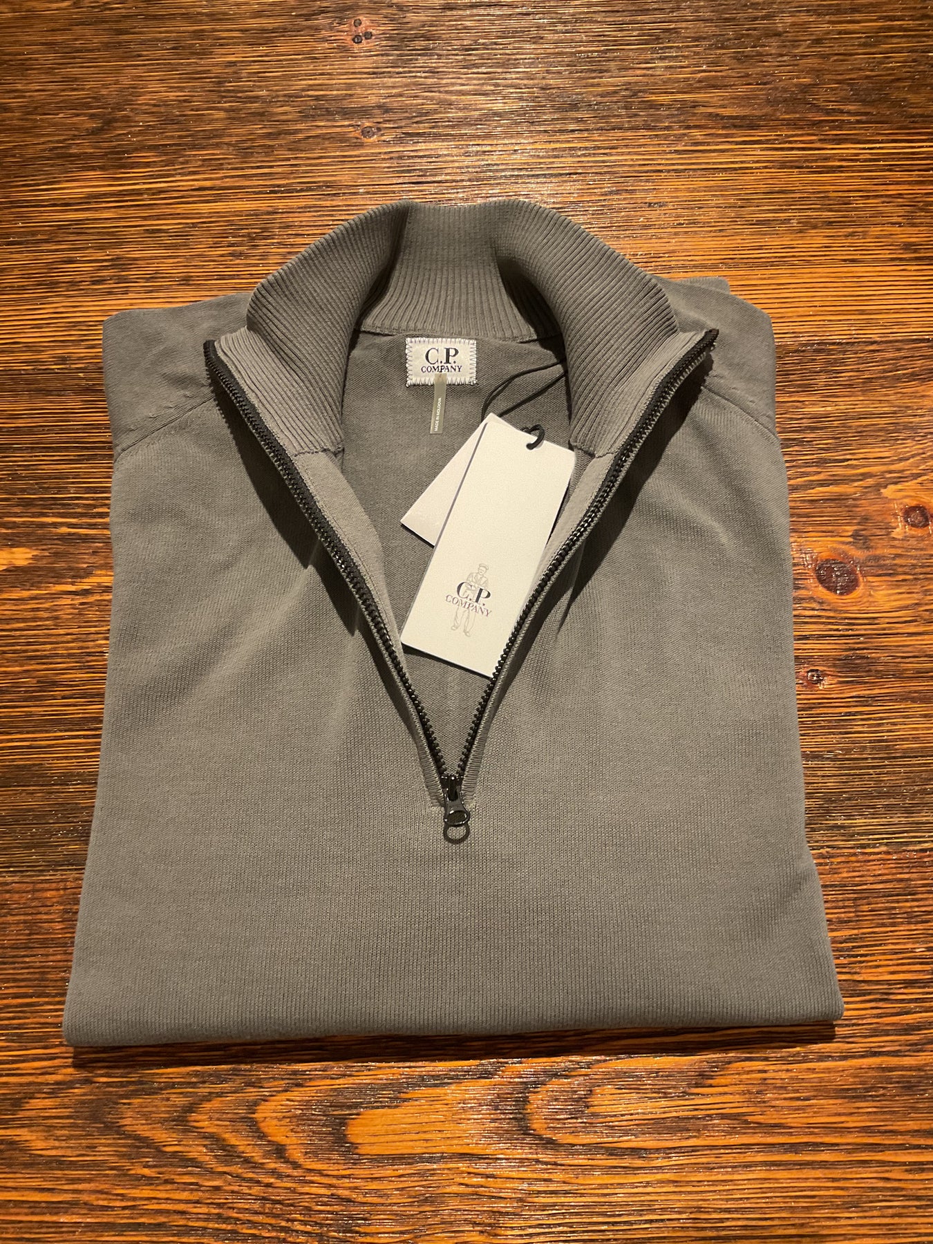 C.P. Company lighter weight cotton in a classic quarter zip knitwear. Appropriate for spring, fall, and spring and made up in a nice neutral olive colour.