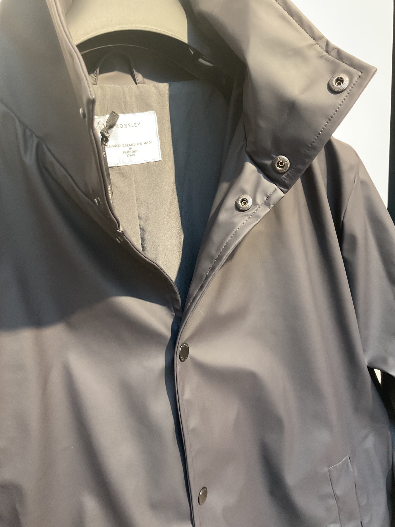 Crossley high neck men’s trench coat in an anthracite grey black. Super hi tech fabrication resistant to all wet weather. Made up in a regular body fit and made in Italy.