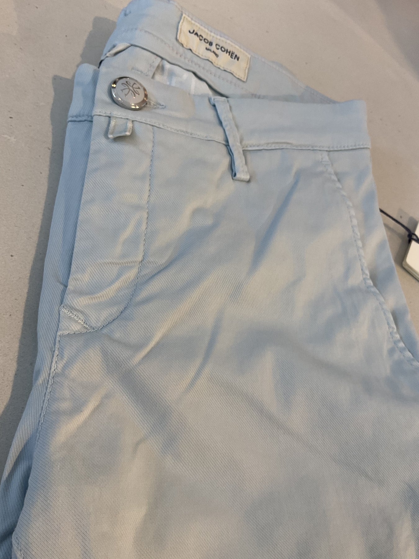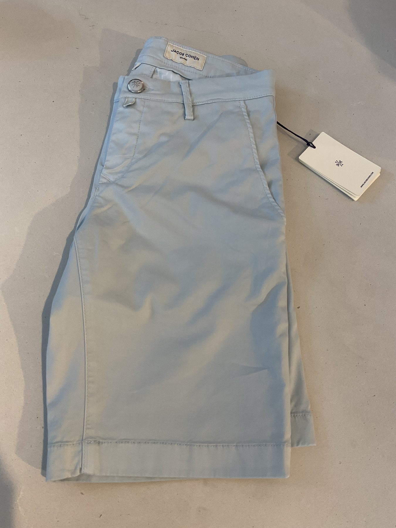 Jacob Cohen classic twill cotton short. Made up in slim modern fit in a soft baby blue colour. Made in Italy.