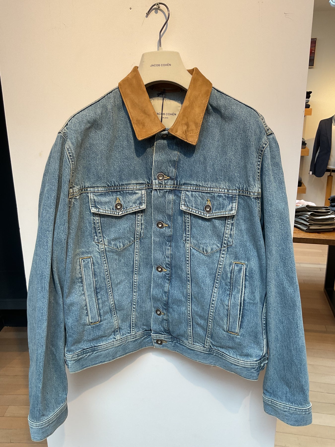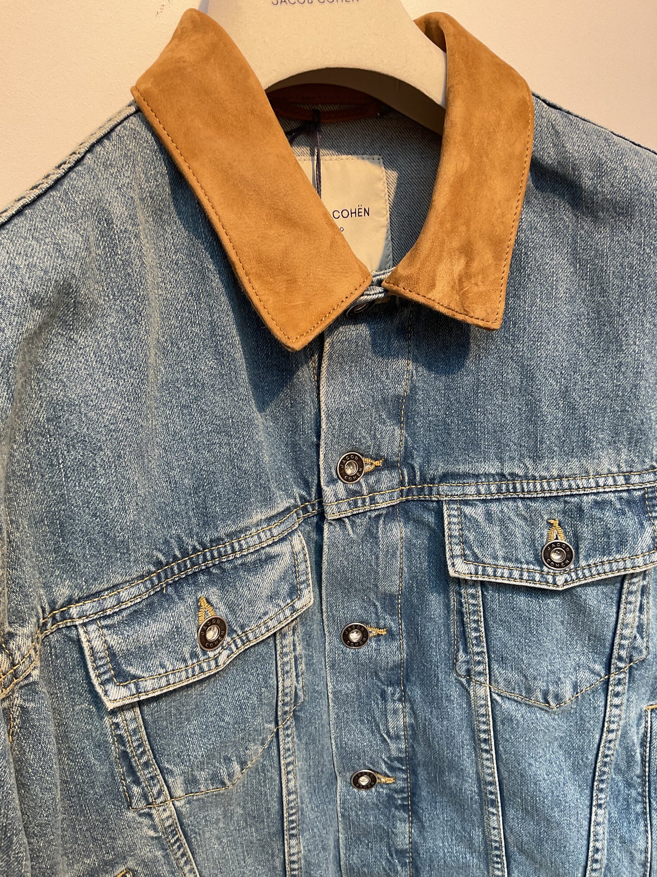 Jacob Cohen full button Jean jacket with contrast leather collar. Made up in a lightweight soft cotton with classic patch on backside. Slim modern fit and made in Italy.