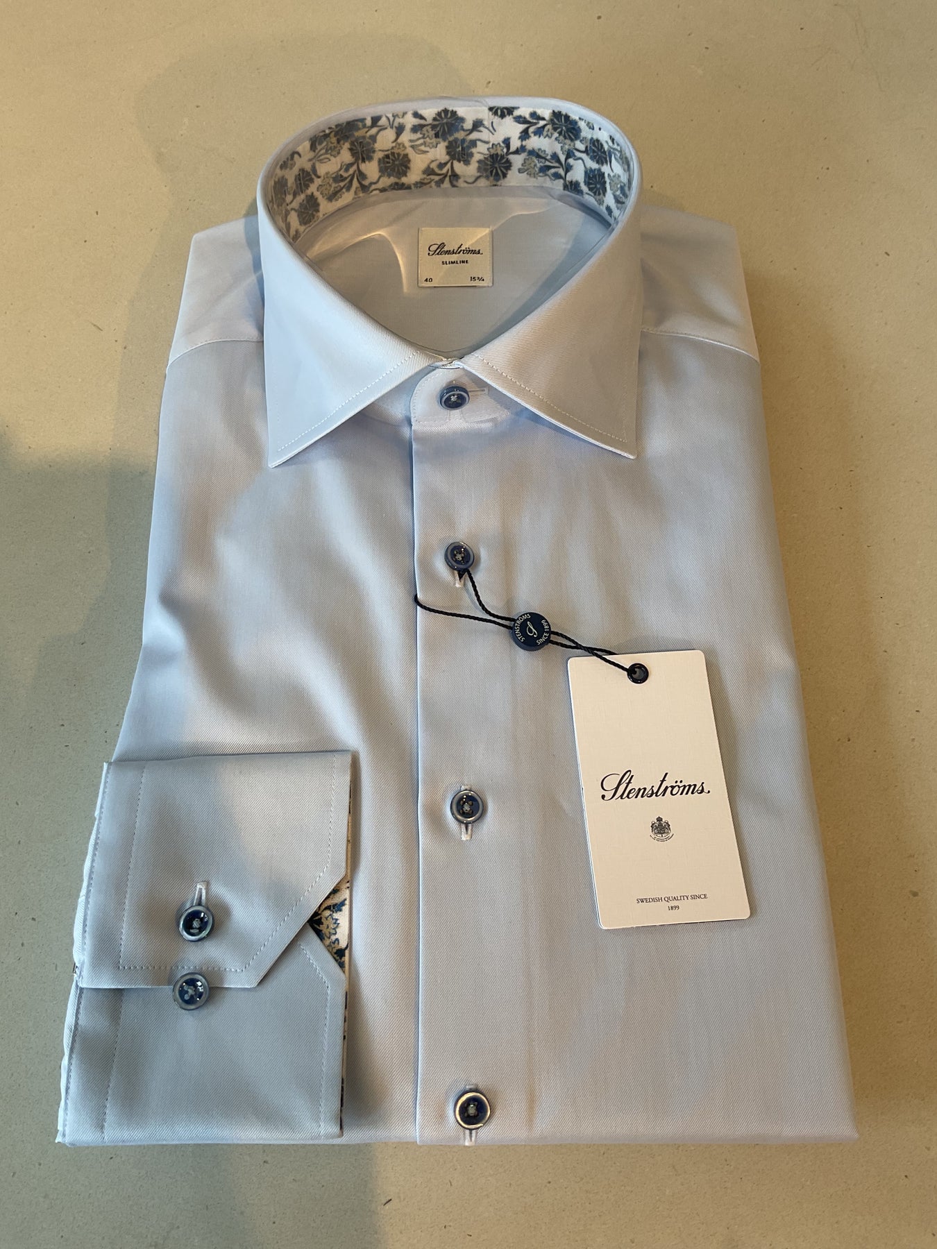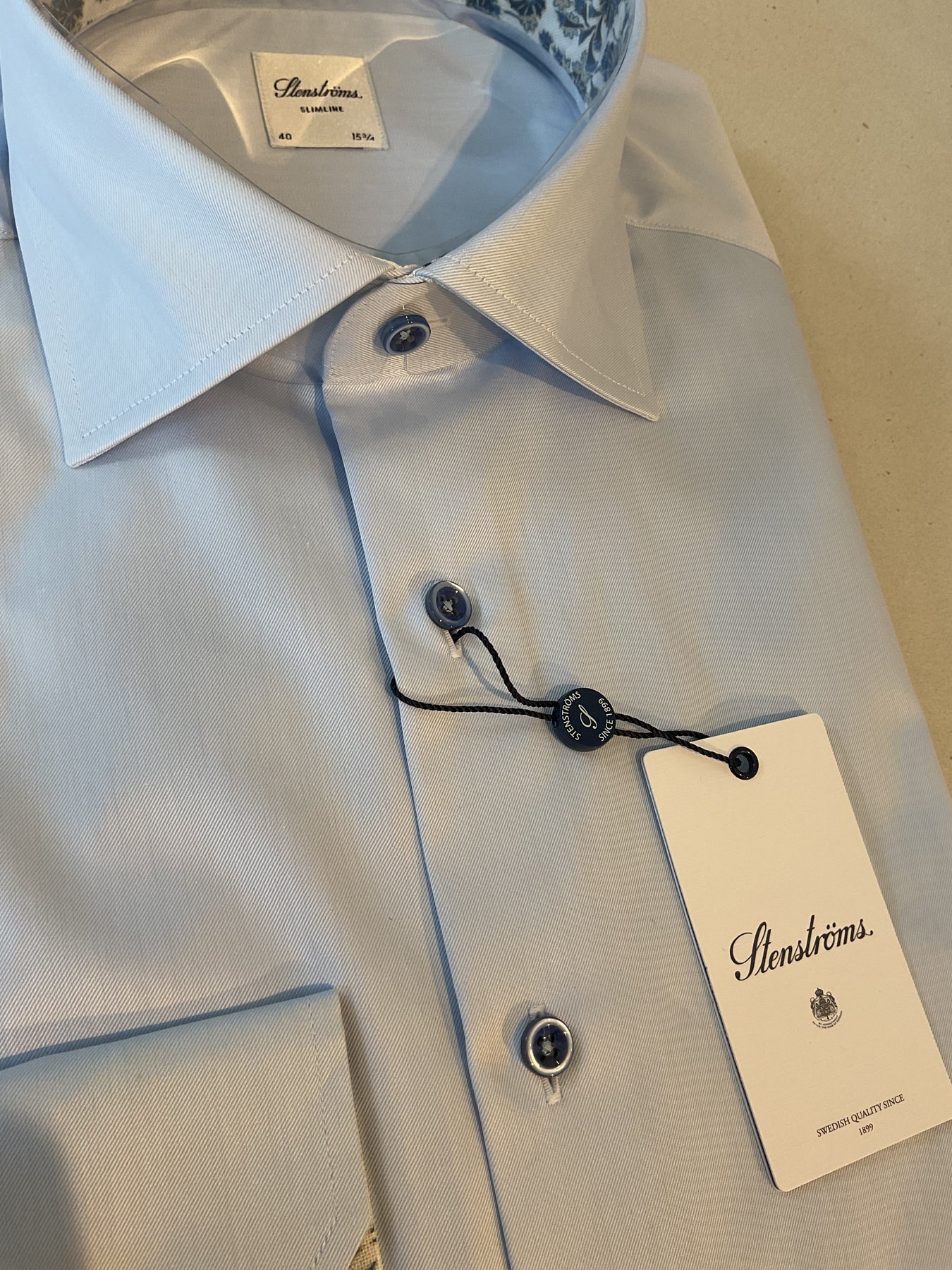 Stenstroms classic long sleeve plain blue twill dress shirt with contrast under collar and cuffs. Made up in the slim line body and appropriate for all four seasons. Made in Sweden.