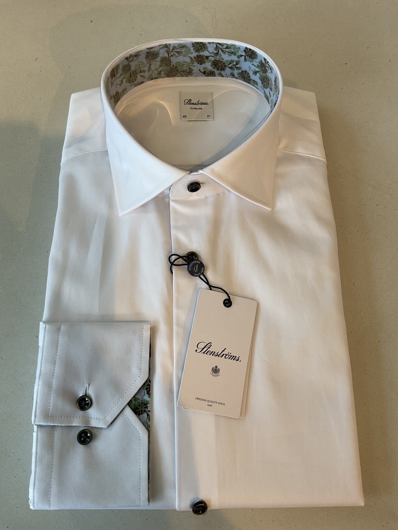 Stenstroms classic plain white twill dress shirt with contrast under collar and cuffs. Made up in a slim line body and appropriate for all four seasons of the year. Made in Sweden.