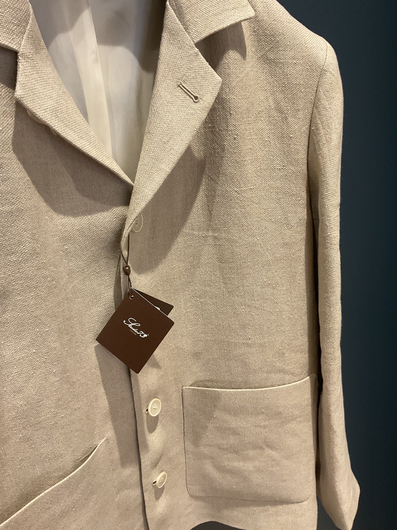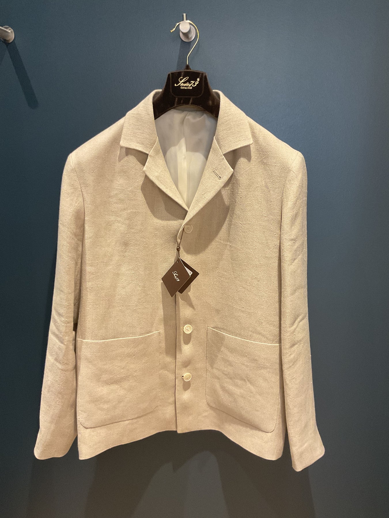 Studio 73 by Cavaliere linen full button shacket jacket in a neutral beige. Nice modern fit.