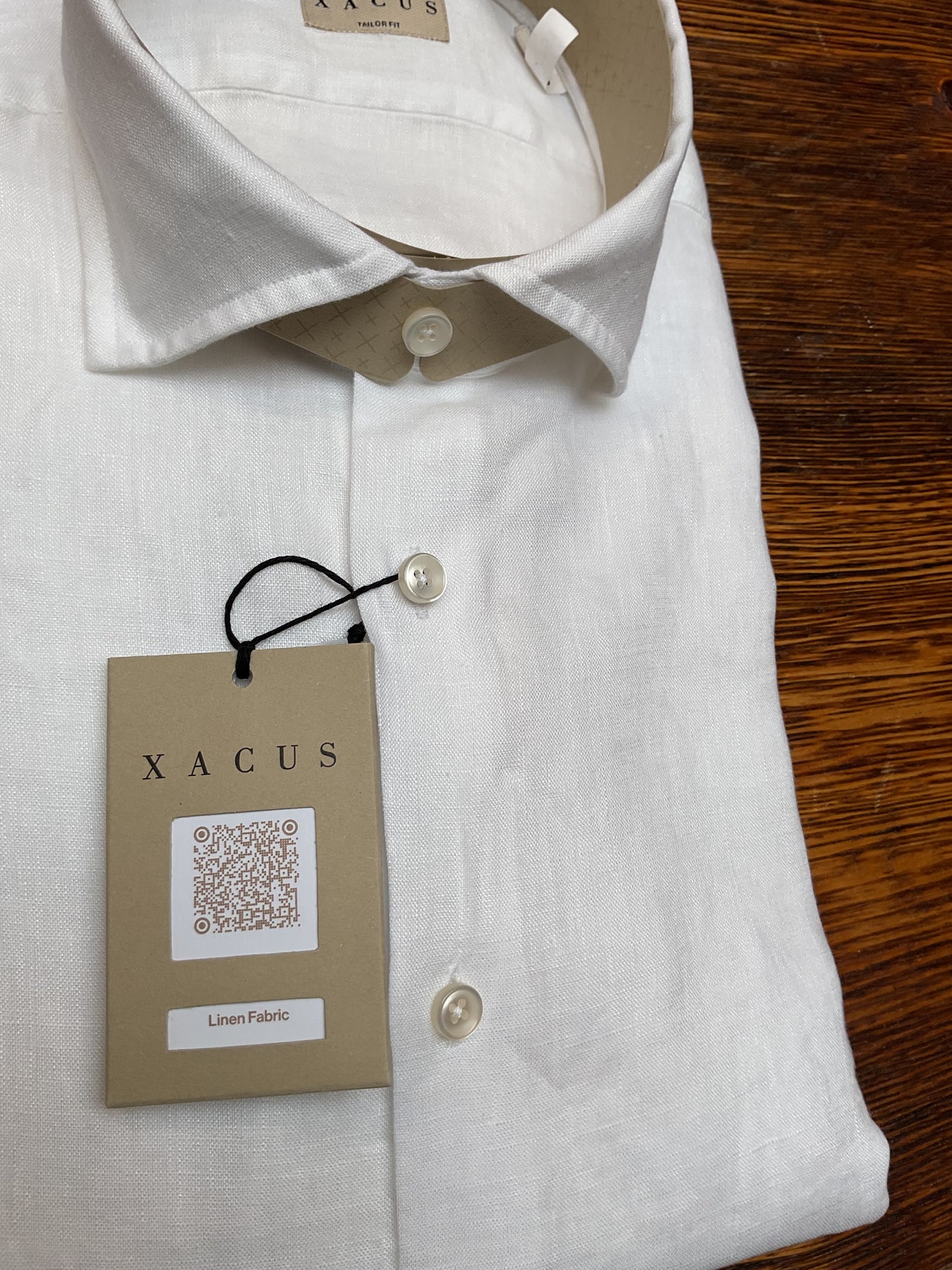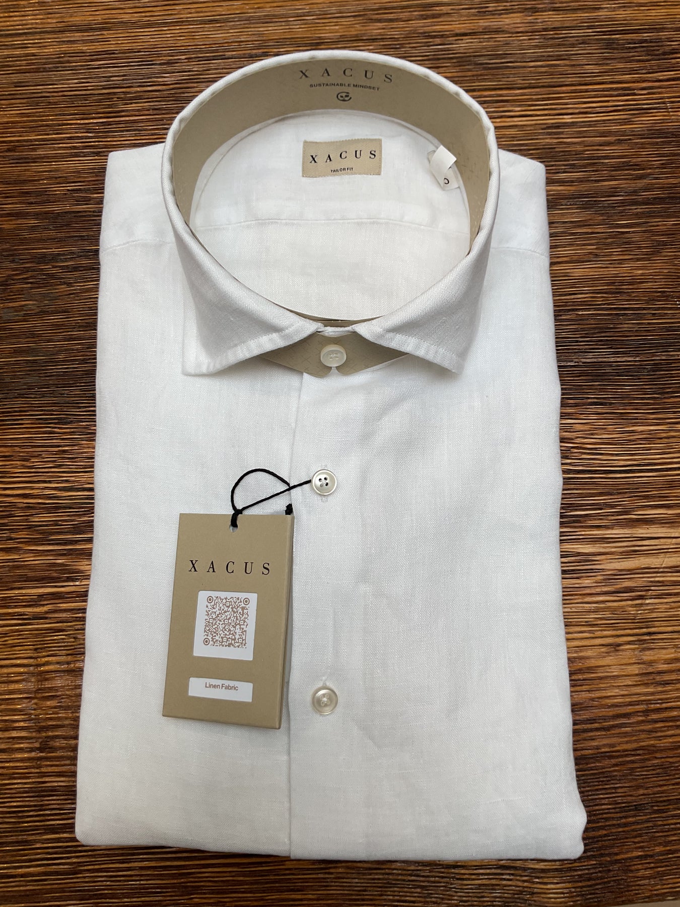 Xacus classic long sleeve full button linen shirt. Made up in pure linen and shown in plain white. Slim modern fit.